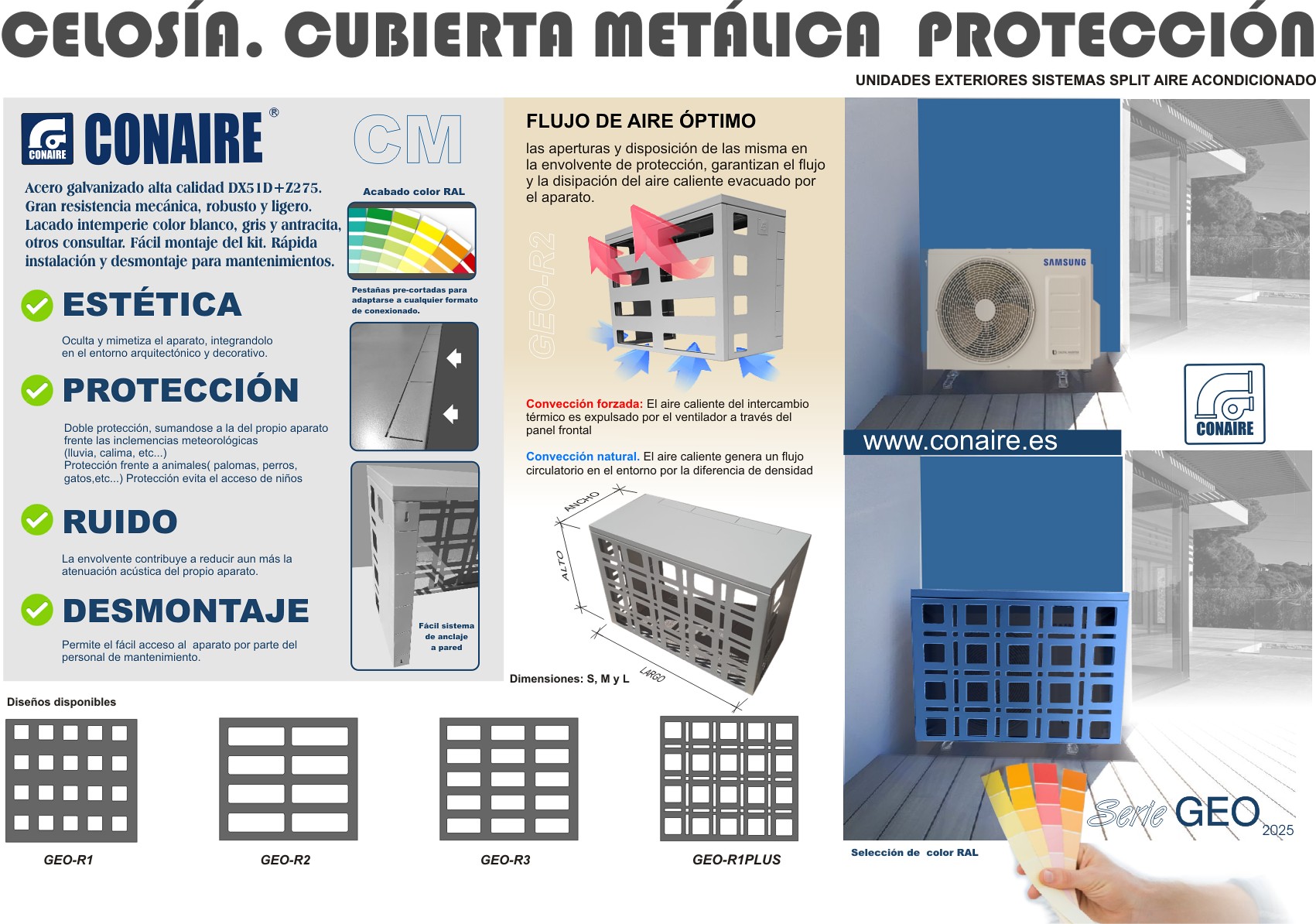 Protector, cubre aire de aire acondicionado exterior, celosía CONAIRE CM, en acero galvanizado de alta calidad DX51D+Z275 (Acabado pintura: imprimación + 2 capas de pintura intemperie)